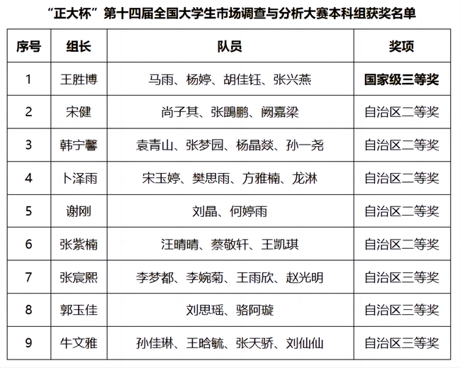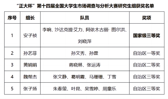 近日,第十四届全国大学生市场调查与分析大赛公布结果,最终我校本科生获国家级三等奖1项,新疆赛区二等奖5项,三等奖3项;研究生获国家级三等奖1项,新疆赛区一等奖1项,二等奖1项,三等奖2项,实现了国奖的新突破。