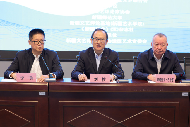 新疆文联二级巡视员巴赫提亚•巴吾东,校党委副书记刘俊,新疆文艺评论家协会副主席张迎春出席开班式。来自新疆师范大学中国语言文学学院、音乐学院、美术学院、新疆艺术学院以及新疆其他高校的师生近300人以线上线下相结合的方式参加活动。活动由新疆文艺评论家协会副主席、我校美术学院院长李勇主持。