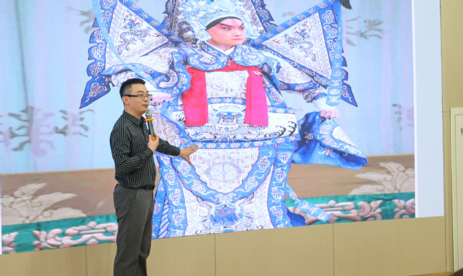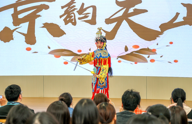 活动以普及京剧基础知识、培养大学生对国粹京剧的兴趣爱好为目的,以文化讲座和互动体验相结合的形式开展。讲座由国家二级演员、国家京剧院青年武生演员、生行王戈老师主讲。王戈老师首先从京剧的起源讲起,依次为在场同学们详细介绍了京剧的行当、本功等京剧基础知识。王老师讲演结合,带着同学们一起互动,趣味横生。在传统戏曲节目赏析环节中,由京剧小演员现场表演《霸王别姬》,新疆京剧团专业戏曲演员王淑敏老师表演剑舞,演员们身着华丽的戏服,带来了技艺精湛、韵味十足、惟妙惟肖的表演,令现场掌声不断。