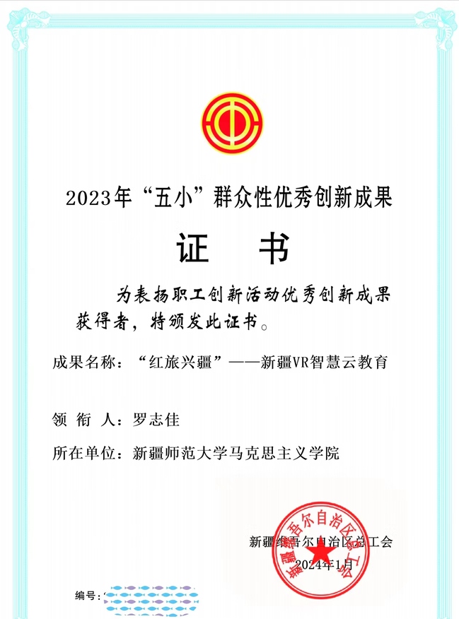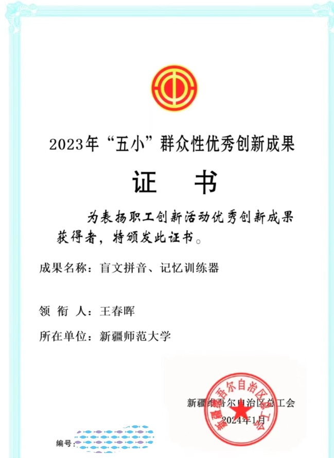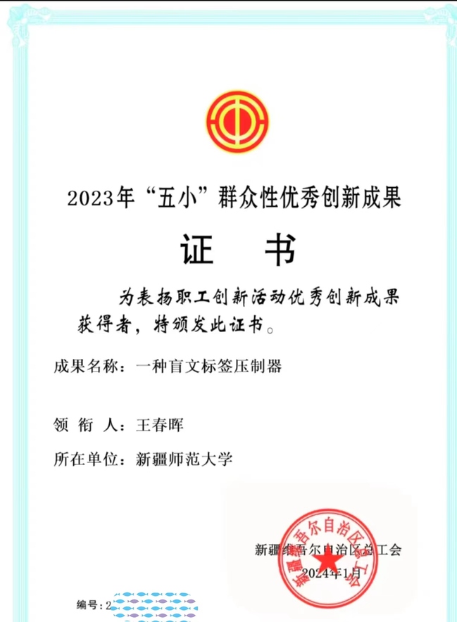 小革新、小发明、小创造、小设计、小建议“五小”群众性优秀创新成果的申报,是由学校工会积极组织,广泛动员各二级工会教师参与申报,经自治区总工会审核,我校共有四个项目荣获自治区“五小”群众性优秀创新成果奖。