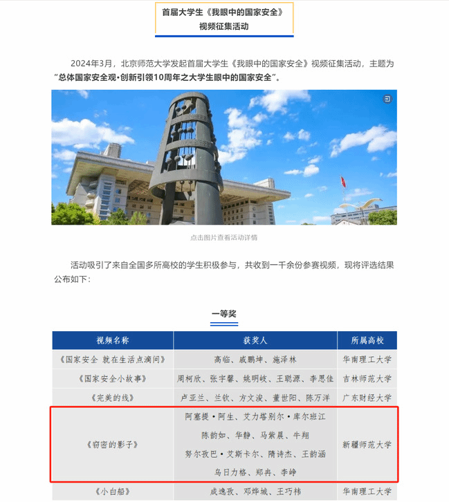 2024年是习近平总书记提出总体国家安全观10周年,在第九个全民国家安全教育日到来之际,北京师范大学发起“总体国家安全观·创新引领10周年之大学生眼中的国家安全”首届大学生《我眼中的国家安全》视频征集活动。4月15日获奖名单出炉,我校选送作品《窃密的影子》荣获全国一等奖。