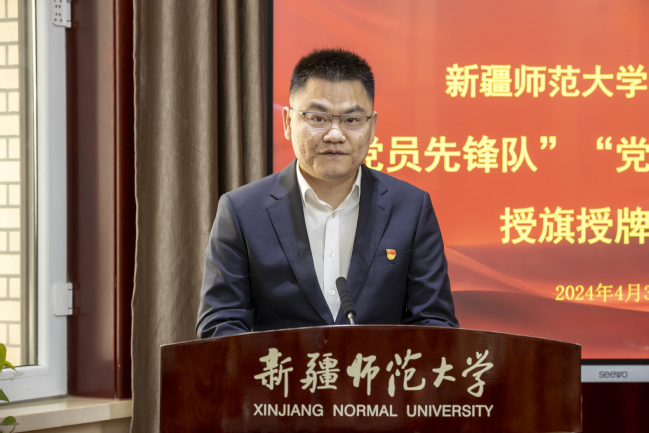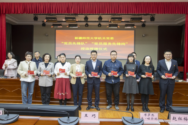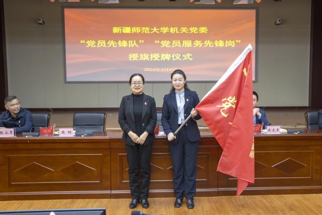 仪式上,机关党委组织委员、党委办公室主任、校长办公室主任周辉领学了《习近平:必须坚持人民至上》。机关党委宣传委员、发展规划处处长关文军宣读了《关于成立“新疆师范大学机关党委党员先锋队”的决定》。机关党委保卫委员、纪委副书记张永景同志宣读了《关于授予彭超等9名同志2024年“党员服务先锋岗”的决定》。机关党委书记张秀红为党员先锋队队长周辉授旗。仪式上还为2024年获得“党员服务先锋岗”的9名同志授牌,参会的全体人员以热烈的掌声对他们表示祝贺。