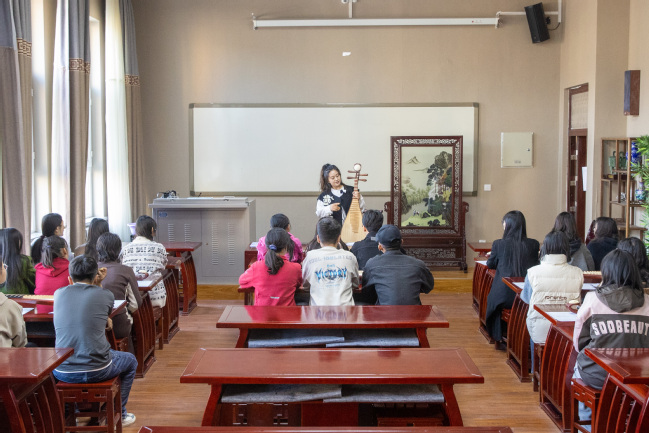 课堂上,郭铭渲老师首先对琵琶的起源、构造等进行了细致的讲解,介绍琵琶为中国民族乐器,自魏晋时期从西域传入中原,开启了一千多年的历史流变,展现了中华民族共同体内部交融交织的发展史,是中华民族共同体具象化的文化符号之一。在示范环节,郭铭渲老师讲解并演奏了多民族风格的音乐作品,充分展示出琵琶作为“民乐之王”婉转优美的旋律。精致细腻的音乐诠释,令在场学生纷纷感到意犹未尽。