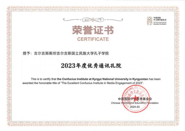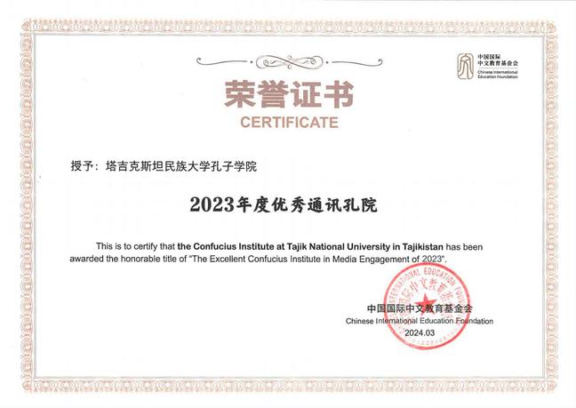 近日,中国国际中文教育基金会授予31家海外孔子学院“2023年度优秀通讯孔院”称号,我校合作建设的塔吉克斯坦民族大学孔子学院和吉尔吉斯国立民族大学孔子学院获此荣誉。