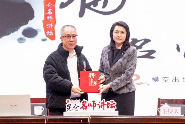 讲座开始前,帕力旦·吐尔逊代表学校向马述忠教授颁发新疆师范大学客座教授聘书。