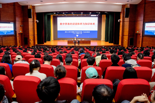在讲座中,马述忠教授从数字贸易的中国话语体系、数字贸易的自主知识体系和数字贸易的学术边际贡献三个方面进行了精彩讲授。马述忠教授结合习近平总书记系列重要讲话精神,回顾了他从传统国际贸易研究到全球价值链研究继而转向数字贸易研究的经历,阐述了他在不同阶段对数字贸易的理解。通过对数字贸易的概念界定,深入浅出地分析了从电子商务到数字贸易的发展演变,通过对中国在数字贸易领域的最新实践以及全球范围内数字贸易的研究动态,将理论性与实践操作内容有效地结合。马述忠教授表示,数字贸易的中国话语体系集中体现着中华文化的传承、保护、创新和中国学者的人文情怀,实践价值方面适应中国转变全球经济治理角色的形势,理论价值方面推动中国社会科学发展,讲座受到了现场师生的一致好评。