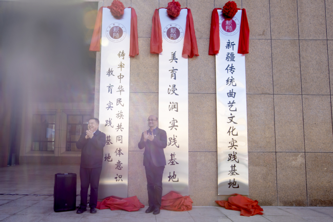 在全场师生的见证下,邓选斌和吾满江·艾力共同为铸牢中华民族共同体意识教育实践基地(美育浸润实践基地)揭牌。