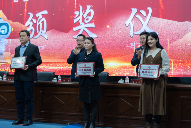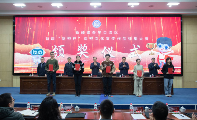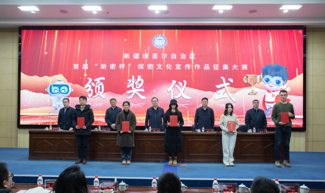 1月29日下午,自治区首届“新密杯”保密文化宣传作品征集活动颁奖仪式在我校昆仑校区国际教育大厦多功能厅举行。自治区国家保密局局长侯睿、自治区教育工委副书记张士民、自治区文联副主席熊红久、自治区党委宣传部巡视员荆朝平出席活动并为获奖者颁奖。校党委常委、副校长帕力旦·吐尔逊,及我校党委办公室、美术学院、计算机科学学院负责同志,学校保密办和获奖学生代表参加活动。