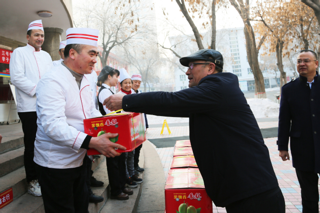 校党委副书记、校长吾满江·艾力向昆仑校区坚守岗位的后勤职工代表送上慰问品