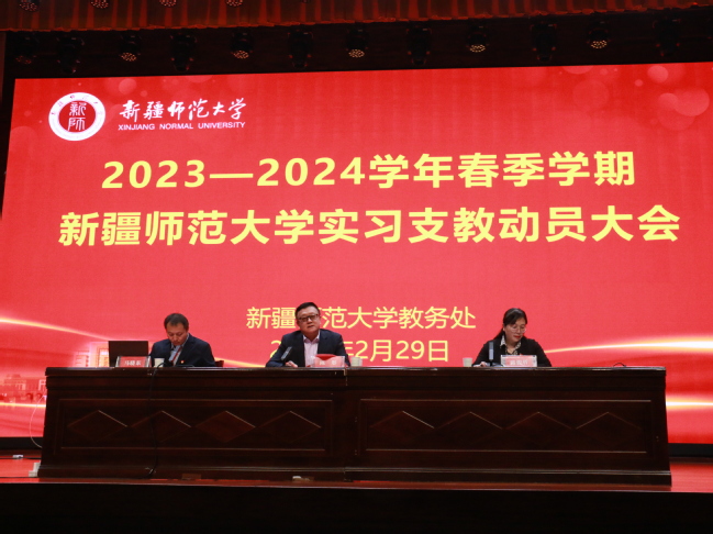 2月29日下午,我校在温泉校区昆仑讲堂召开师范生实习支教动员大会。校党委常委、副校长陈彤出席会议,教务处、历史与社会学院、教育科学学院等9个学院部门负责人,以及近600名师生参加会议,其余支教学生通过线上参会。会议由教务处副处长马晓东主持。