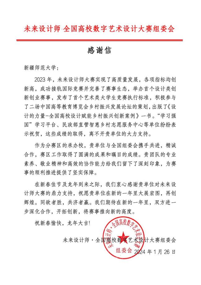 近日,我校收到来自全国高校数字艺术设计大赛组委会的感谢信,对我校在“未来设计师·全国高校数字艺术设计大赛”成功举办过程中给予的大力支持表示感谢。