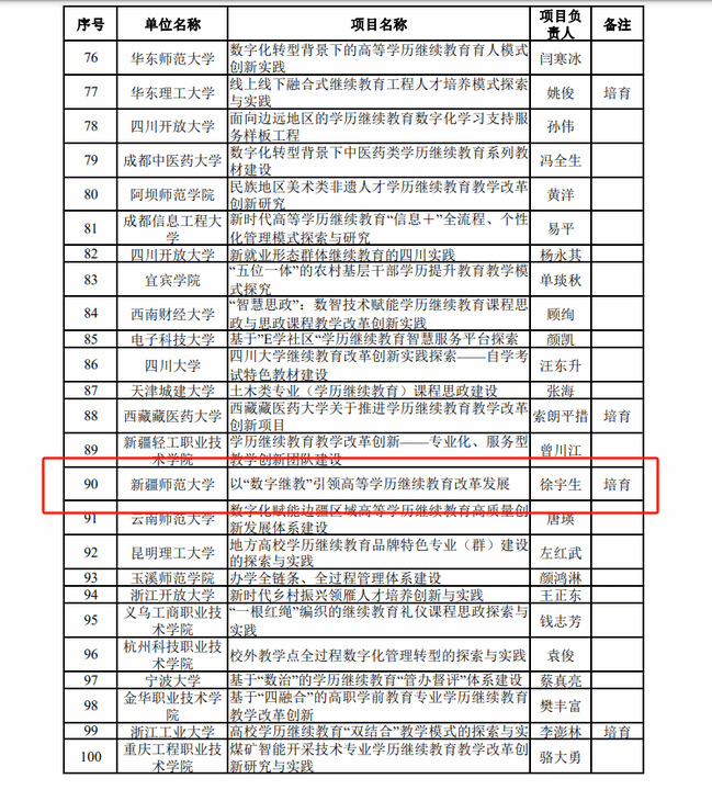 为深入贯彻党的二十大精神,落实教育部关于加强高等教育、继续教育、职业教育协同创新、融通发展的要求,助力学习型社会、学习型大国建设,我校高等学历继续教育坚持信息化、数学化改革方向,不断提升服务社会经济发展、满足人才培养需求的能力和水平。2023年我校继续教育学院申报的《以“数字继教”引领高等学历继续教育改革发展》项目,经自治区教育厅审核、教育部专家评选,成功入选教育部2023年学习型社会建设(高等继续教育领域)学历继续教育教学改革创新重点任务。