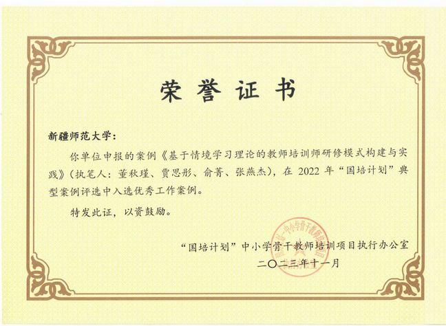 近日,教育部“国培计划”中小学教师培训项目执行办公室发布了《关于公布2022年“国培计划”优秀典型案例的通知》。我校继续教育学院报送的教师培训典型案例《基于情景学习理论的教师培训师研修模式构建与实践》入选2022年度“国培计划”优秀典型工作案例。据悉,本次全国共评选优秀典型工作案例40项,新疆维吾尔自治区仅此1项。