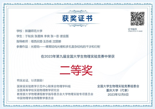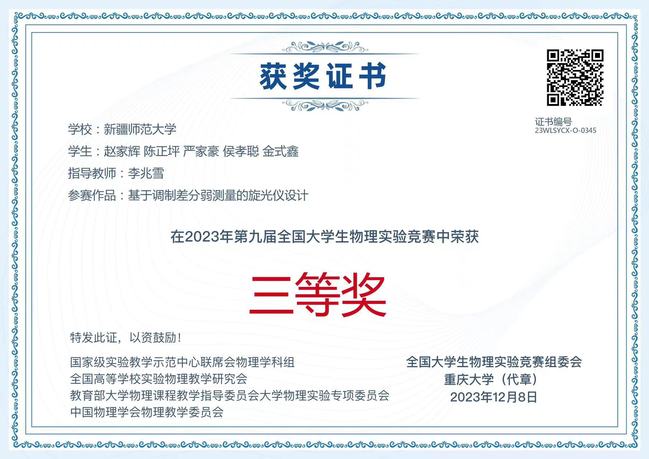 竞赛由国家级实验教学示范中心联席会物理学科组、全国高等学校实验物理教学研究会、教育部大学物理课程教学指导委员会大学物理实验专项委员会、中国物理学会物理教学委员会主办,重庆大学承办,《物理实验》杂志协办。经历复赛、决赛,900余位评审专家对2251项参赛作品进行评审,最终评出“命题类创新作品”“自选课题类创新作品”和“大学生物理实验讲课比赛”三个类别的奖项,332所高校获优秀组织奖。物理与电子工程学院选派的5支代表队喜获佳绩,荣获命题类二等奖1项、三等奖1项,自选类三等奖1项、优秀奖1项,讲课类优秀奖1项,学校获优秀组织奖。