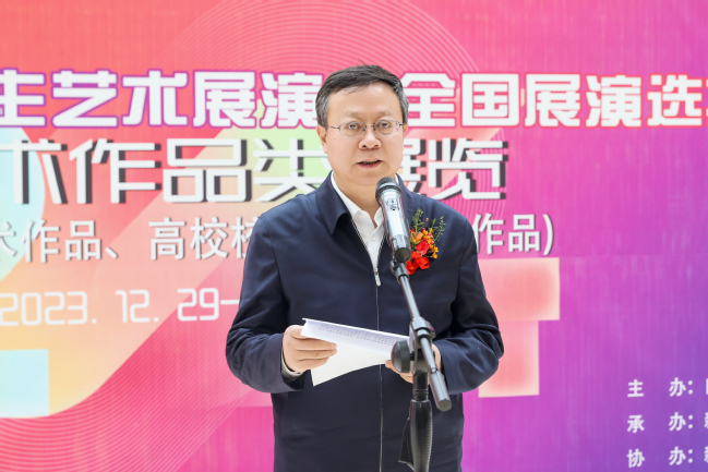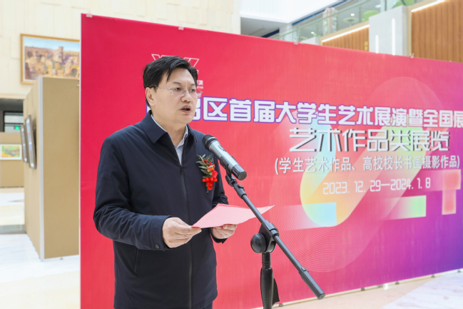 12月29日上午,由自治区教育厅主办,新疆师范大学承办、新疆师范大学美育中心协办的自治区首届大学生艺术展演暨全国展演选拔活动在我校温泉校区图书馆拉开帷幕。自治区人民政府总督学、教育厅党组成员孙长波出席开幕式并讲话,校党委常委、副校长陈彤致辞,校党委常委、宣传部部长高靖主持开幕式。驻乌鲁木齐各高校及美育优秀案例获奖高校分管校领导、师生代表等100余人参加开幕式。