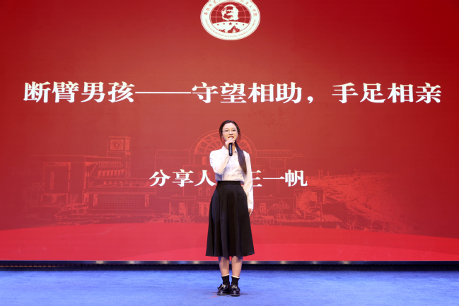 “在这场1400多公里的救助赛中,每个人都是中华民族共同体理念的践行者。我们见证了人民至上、生命至上的崇高信念,见证了人民的热情与善良。正是有了他们的信念和共同的努力,这样一个挑战极限的生命奇迹,才能汇聚力量得以成功。”分享人王一帆为大家讲述了千里接力共同营救和田断臂男孩的温暖故事。