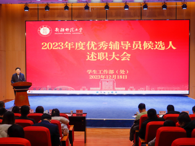 12月18日,我校在后勤楼二楼报告厅召开2023年度优秀辅导员候选人述职会,校党委常委、宣传部部长高靖,相关职能部门负责人,各学院党委副书记及全体辅导员参加述职会。