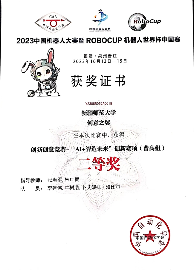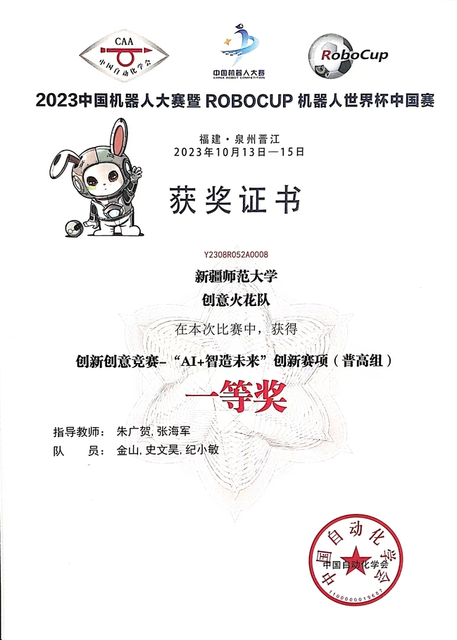 中国机器人大赛暨RoboCup机器人世界杯中国赛是我国最具影响力、最权威的机器人学术竞赛之一。本届大赛国内外1084支代表队共计5500余名师生参加比赛,参赛高校数量、参赛队伍数量、参加人数均创大赛历史之最。面对如此激烈的竞争,我校由计算机科学与技术学院金山、史文昊、纪小敏三位同学组成的创意火花队与李建伟、牛树浩、卜艾妮排·海比尔三位同学组成的创意之翼代表队,凭借扎实的人工智能技术基础、创新思维和团队合作精神,成功突破重重难关,赢得了评委们的一致认可。最终分别获得创新创意赛项中一等奖及二等奖。
