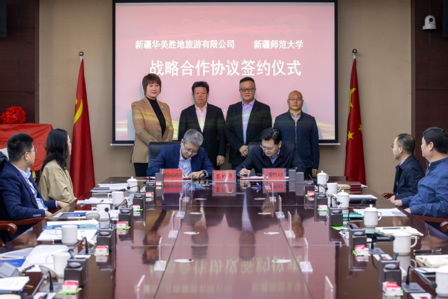 12月5日上午,中国绿发投资集团有限公司总经理助理兼现代服务业事业部总经理,兼幸福产业公司党委书记、负责人,新疆华美胜地旅游有限公司执行董事李景海一行,前来我校考察交流并签订战略合作协议。自治区党委宣传部文化润疆工作推进处处长孙浩,校党委常委、副校长陈彤,校党委常委、宣传部部长高靖出席签约仪式。签约仪式由我校中华文化符号与中华民族形象研究中心主任、外国语学院党委书记董馥伊主持。