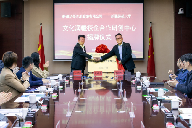 在双方人员见证下,与会领导共同签署了战略合作框架协议并为文化润疆校企合作研创中心揭牌。