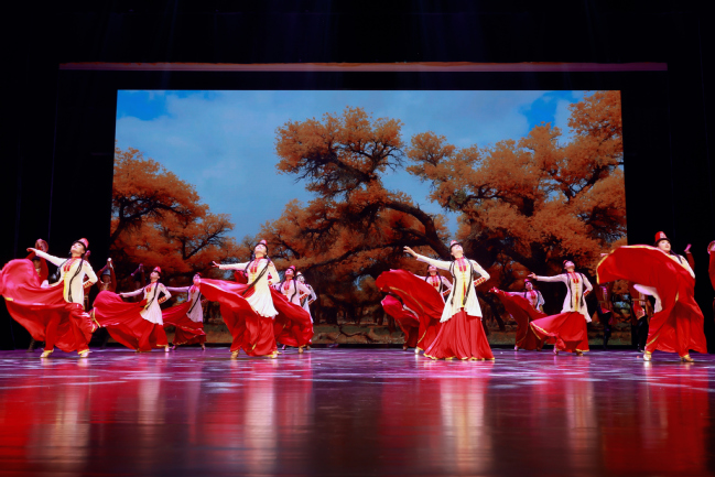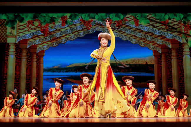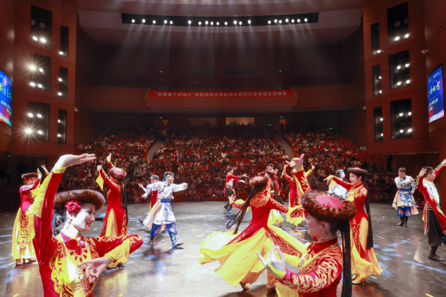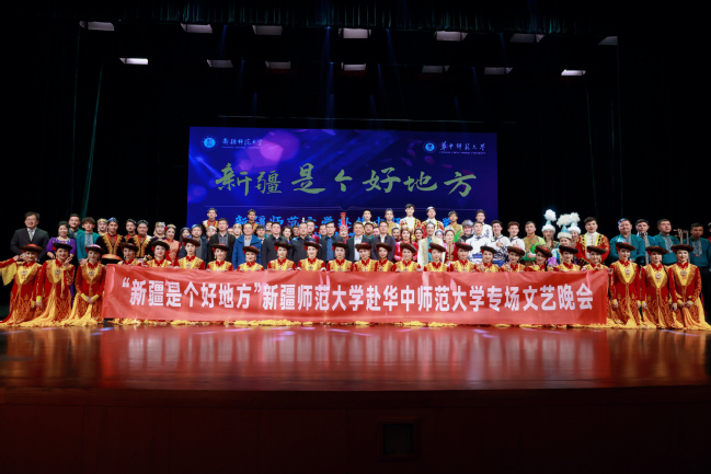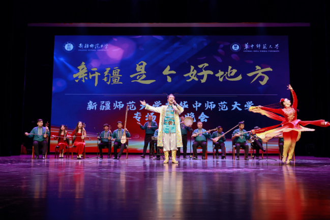 当晚的演出在我校木卡姆乐团带来的器乐联奏《昆仑之春》《喜洋洋》《帕米尔,我的家乡多么美》《好日子》《金蛇狂舞》中拉开了帷幕,音符跳跃,声韵悠远,瞬间点燃了现场气氛;我校师生带来的舞蹈《刀郎麦西来甫》《帕米尔之情》《骏影追风》《黑走马》《朱拉》精彩纷呈,让观众体验新疆不同民族的风情之余也感受到了新疆人特有的热情与真诚;歌曲《领航》《吐鲁番的葡萄熟了》《阿娜尔汗》《七月的草原》《巴郎仔》《长调情》展现了新疆各民族文化之美,诉说了新疆各族人民团结奋进共建美好家园的心愿;器乐演奏《父亲赞》《乌鲁木齐的天空》弹奏出新疆古老与现代交织的新乐章;华中师范大学的同学们带来的歌曲《云中恋歌》描绘了美不胜收的土家山水画,讲述了土家儿女之间甜蜜欢乐的生活故事;舞蹈《妹娃过河》展现了土家人对生命的热情与赞颂,体现了别样的文化魅力;晚会尾声,全场在《我们新疆好地方》的载歌载舞中圆满落幕。