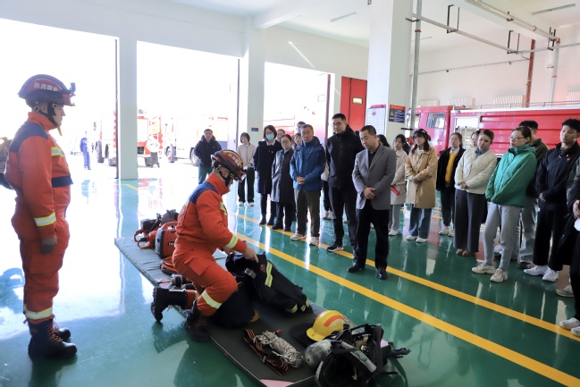 为深入贯彻落实习近平总书记关于安全生产的重要论述,进一步增强党员干部的安全意识,在第32个全国消防安全宣传教育日到来之际,11月4日,我校机关党委组织组织部党支部、团委党支部、数学科学学院学生第三党支部前往乌鲁木齐市水磨沟区消防大队书苑路消防救援站组织开展“党旗映天山”主题党日活动。校党委常委、组织部部长胡毅涛,“胡杨先锋”优秀学生党员培训班、“青马班”学员代表参加支部活动。师生共同近距离体验消防救援人员的工作,实地学习消防救援相关知识。