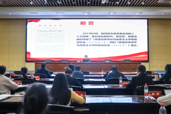 教育部马克思主义理论教育指导委员会委员、新疆师范大学副校级领导、马克思主义学院学术院长孙秀玲教授围绕《普通高等学校马克思主义学院建设标准》,从“组织领导与管理”“思政课教学”“教师队伍建设”等方面,结合马克思主义理论学科建设经验,对新建设标准进行全面详细的解读。她指出,要对标新标准,聚焦“集体备课制度”“大思政课教育基地建设”“大中小思政课一体化建设”和“共建结队活动”等重要任务,不断推动学院高质量发展。