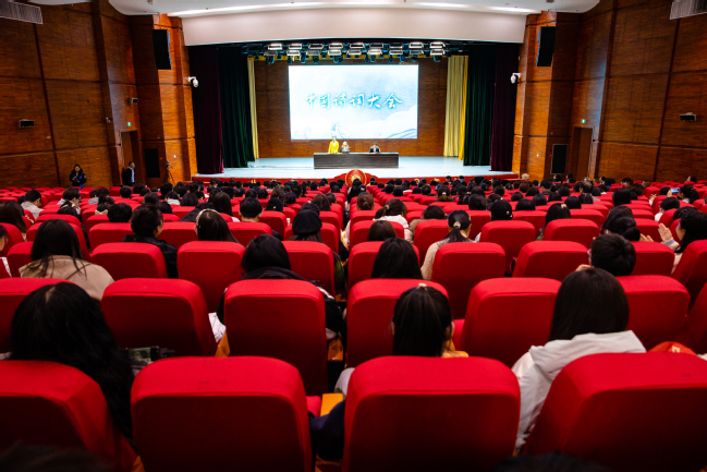 面试选拔结束后,央视导演和出题专家为各参赛单位领队、参赛选手及陪同人员,以及我校中国语言文学学院的诗词爱好者们详细讲解了“中国诗词大会”节目8年的前进与变革、赛制与情怀,同时对如何将“爱诗”之心作为人生精进的常态做了分享和辅导。三百余名学子现场聆听,台上台下互动交流,妙句连珠,气氛热烈。