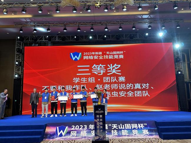 10月31日,2023年新疆“天山固网杯”网络安全技能竞赛在乌鲁木齐圆满落幕。通过激烈角逐,我校参赛队伍荣获学生组团队赛一等奖1项,学生组团队赛三等奖2项的优异成绩。这是我校连续两年荣获新疆“天山固网杯”网络安全竞赛团体赛第一名,受到了自治区党委网信办和自治区教育厅的一致好评。
