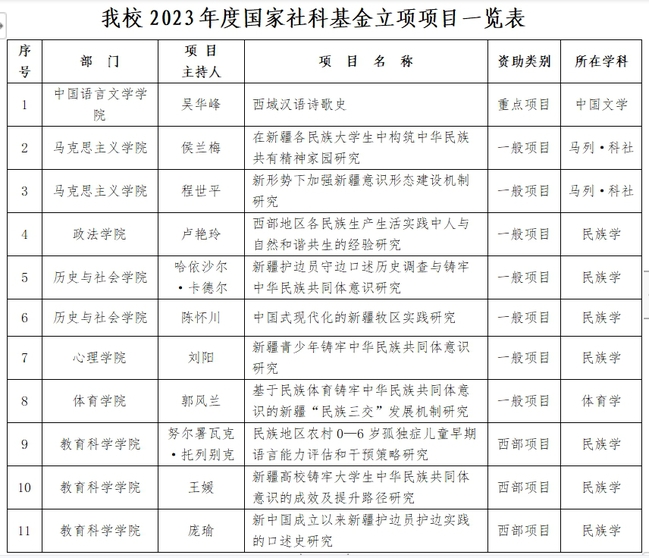 经全国哲学社会科学工作办公室批准,2023年度我校共有11项国家社会科学基金项目喜获立项,其中重点项目1项、一般项目7项、西部项目3项,获资助经费235万元。立项项目涉及学科主要有:民族学7项、马列·科社2项、中国文学和体育学各1项。