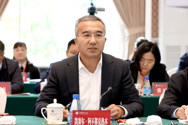 凯赛尔·阿不都克热木代表自治区党委、自治区人民政府,向出席本次会议的领导、专家学者和老师们表示热烈欢迎,向各援疆高校长期以来对新疆师范大学、对新疆教育事业的关心支持表示衷心的感谢并致以崇高的敬意。凯赛尔·阿不都克热木指出,教育援疆是对口援疆工作的重要组成部分,在以习近平同志为核心的党中央亲切关怀下,在教育部的指导帮助下,各对口支援共建高校把教育援疆作为重大政治责任,坚持科学援疆、真情援疆、持续援疆,助力新疆高等教育高质量发展,帮助新疆师范大学在人才培养质量、师资队伍建设、科研服务能力等方面取得了新的突破。面对新形势新任务,新疆比以往任何时候都更加需要教育对经济社会发展的支撑,比以往任何时候都更加需要加快培育各类专业人才,新疆师范大学在长足进步的同时还面临诸多挑战。凯赛尔·阿不都克热木表示,进一步推动新疆师范大学高质量发展,需要各对口支援共建高校在改进办学模式上持续用力,进一步提升新疆师范大学人才培养质量;在深化文化润疆上持续用力,进一步铸牢各族师生中华民族共同体意识;在深化智力援疆上持续用力,进一步建强干部教师队伍;在推动科技创新上持续用力,进一步服务国家高水平科技自立自强;在突出就业导向上持续用力,进一步提高学生就业质量;在加强沟通对接上持续用力,进一步提高合作办学水平。希望各高校一如既往地关心支持新疆高等教育发展,继续加大支援新疆师范大学力度,进一步深化校际合作,聚焦合作创新、强化智力支持,带动新疆师范大学学科、科研能力、师资队伍、学校管理再上新台阶。