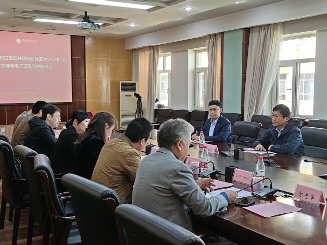 中国科学技术大学、天津大学对口支援共建新疆师范大学物理与电子工程学院座谈会上,双方围绕博士点申报、研究生联合培养、实验室建设、教师学历提升、项目申报等议题展开讨论交流,双方就充分发挥天津大学精密仪器与光电子工程学院、中国科学技术大学物理学院的学科优势,以人才培养为中心,以学科建设、科学研究为重点,开展与我校物理与电子工程学院的务实合作达成一致意见,也为我校“银龄学者”计划开展、科研成果产出、对接自治区“八大产业集群”提供了思路。天津大学精密仪器与光电子工程学院党委书记刘琨、中国科学技术大学物理学院党委副书记张永生,新疆师范大学物理与电子工程学院领导班子成员、学科带头人及各系、室、中心主任参加座谈会。