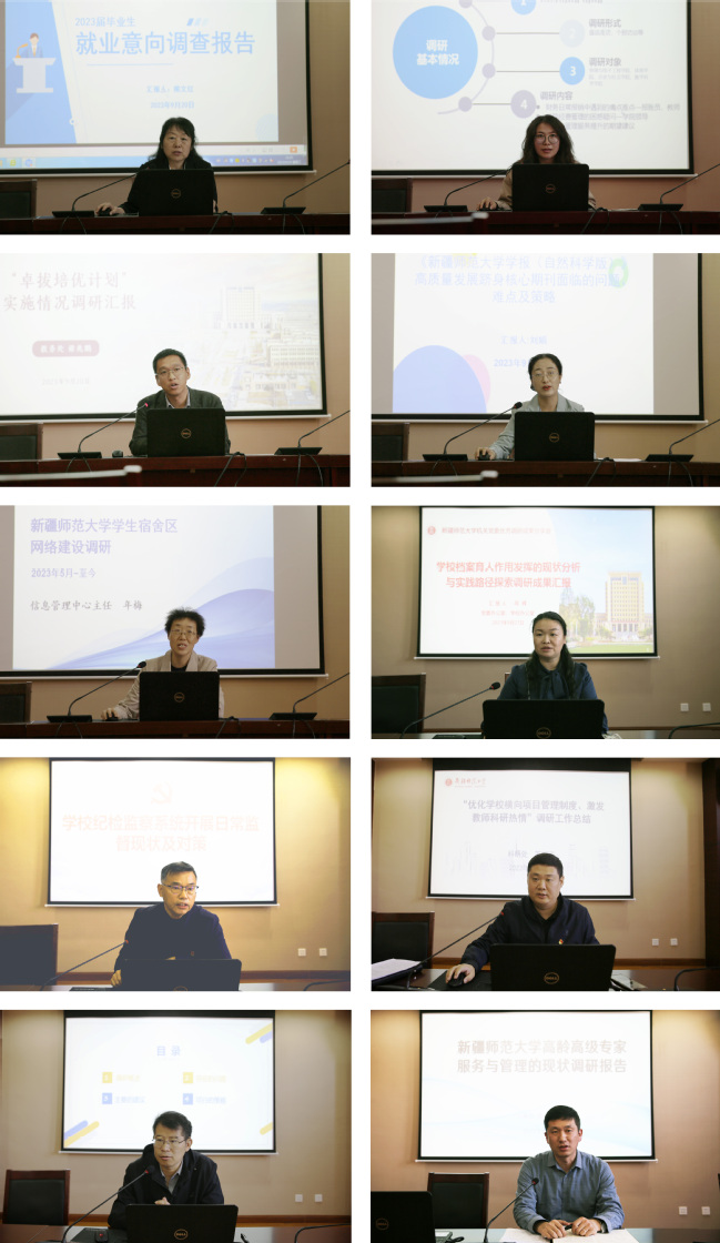 在9月20日第一场分享会上,学生就业指导办公室主任熊文红、计财处处长王芸、教务处副处长毋兆鹏、学报编辑部副主任刘娟、信息管理中心(网信办)主任年梅分别围绕《新疆师范大学2023届毕业生就业意向调查》《着力化解报账难突出问题,改进财务管理服务方式》《新疆师范大学“卓拔培优计划”实施情况调研》《< 新疆师范大学学报(自然科学版)>高质量发展跻身核心期刊面临的问题、难点及策略》《新疆师范大学学生宿舍区网络建设调研》等成果进行了分享。