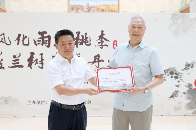 在开幕式上,校党委副书记王志勇代表学校党委向欧阳铮先生心系教育事业,向我校捐赠296幅精品书画作品的义举表示感谢,并为欧阳铮先生颁发了捐赠证书。他表示,欧阳铮先生捐赠的部分书画作品前期经校友会办公室分批装裱,在校内公共区域展示,起到了良好的文化育人作用。期待广大师生和校友推介更多精品佳作走入校园,以铸牢中华民族共同体意识为主线,有形有感有效推进文化润疆工程,用中华优秀传统文化滋养师生心灵,为党和国家培养出更多德智体美劳全面发展的社会主义建设者和接班人作出积极贡献。