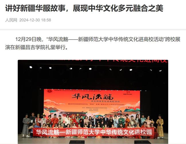 12月29日晚,“华风流觞——新疆师范大学中华传统文化进高校活动”跨校展演在新疆昌吉学院礼堂举行。