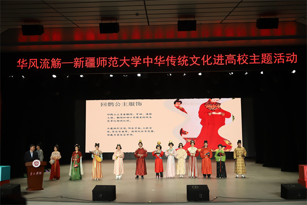“华风流觞——新疆师范大学中华传统文化进校园活动”作为新疆维吾尔自治区社科联中华传统文化进高校的重点项目之一,以新疆吐鲁番地区出土唐代服饰为核心,通过丰富展示方式,创新展示内容,通过服饰系统展示,让文物活起来。用服饰科普讲座、华服走秀、情景剧等方式,使观众在欣赏古代服饰艺术的同时接受社科知识普及,进一步增强对于中华文化的认同,铸牢中华民族共同体意识。