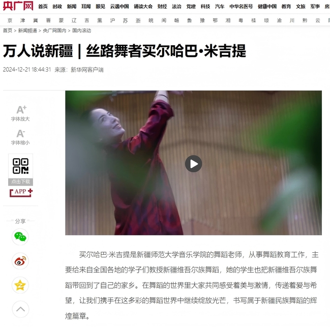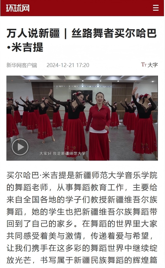 买尔哈巴·米吉提是新疆师范大学音乐学院的舞蹈老师,从事舞蹈教育工作,主要给来自全国各地的学子们教授新疆维吾尔族舞蹈,她的学生也把新疆维吾尔族舞蹈带回到了自己的家乡。在舞蹈的世界里大家共同感受着美与激情,传递着爱与希望,让我们携手在这多彩的舞蹈世界中继续绽放光芒,书写属于新疆民族舞蹈的辉煌篇章。