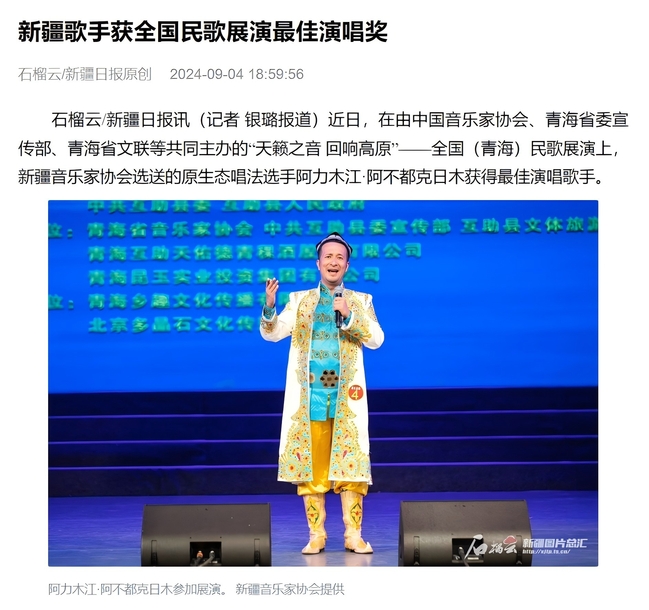 石榴云/新疆日报讯(记者 银璐报道)近日,在由中国音乐家协会、青海省委宣传部、青海省文联等共同主办的“天籁之音 回响高原”——全国(青海)民歌展演上,新疆音乐家协会选送的原生态唱法选手阿力木江·阿不都克日木获得最佳演唱歌手。