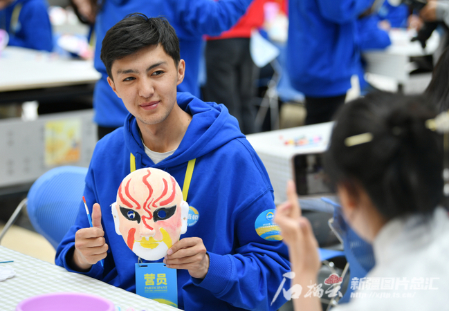 4月15日,2024年“汉语桥”上海合作组织国家青年学生春令营营员在新疆师范大学展示自己绘制的戏曲脸谱。