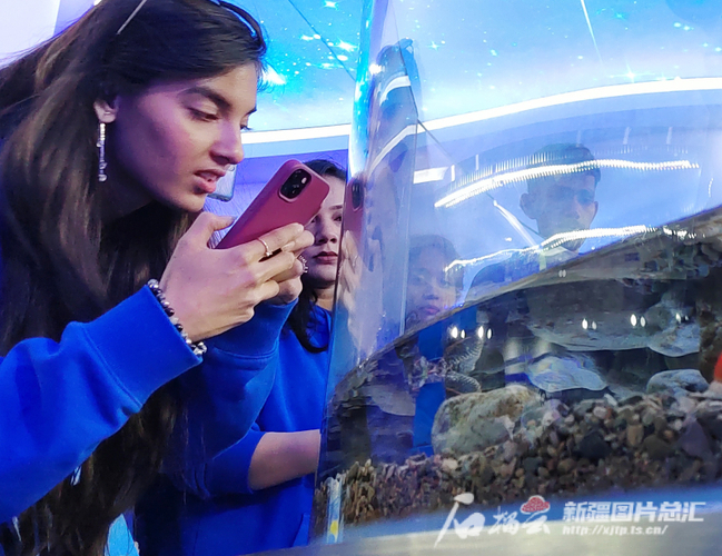 4月15日,2024年“汉语桥”上海合作组织国家青年学生春令营营员在新疆师范大学生命科学学院北鲵馆拍摄北鲵。