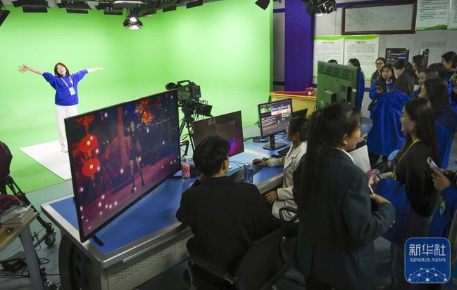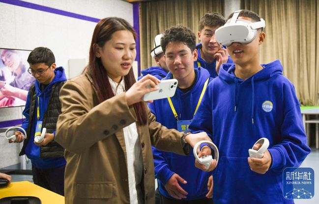 4月15日,参加春令营的来华青年学生在新疆师范大学学生(左二)的引导下体验VR等设施。
