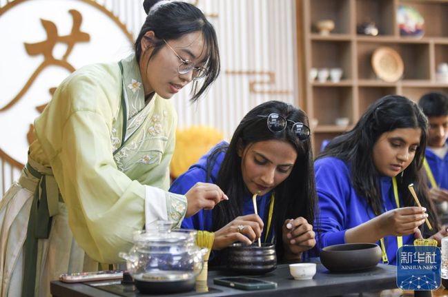 4月15日,参加春令营的来华青年学生在新疆师范大学学生(左)的指导下学习茶艺。