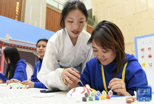 4月15日,参加春令营的来华青年学生在新疆师范大学学生(中)的指导下绘制京剧脸谱。