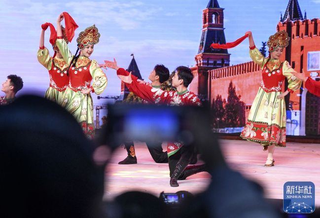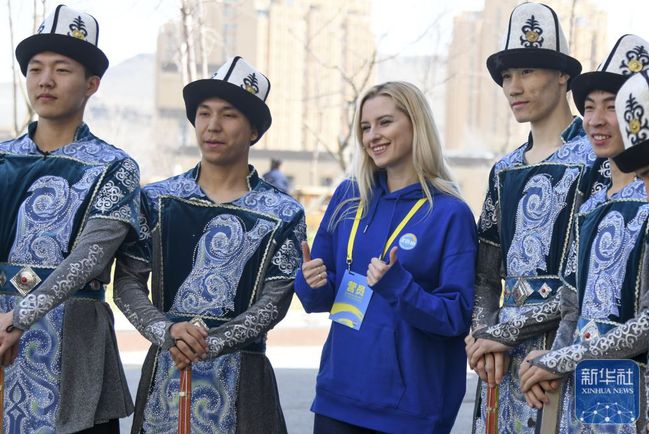 4月15日,参加春令营的来华青年学生(左三)与新疆师范大学学生在开营仪式表演结束后合影。