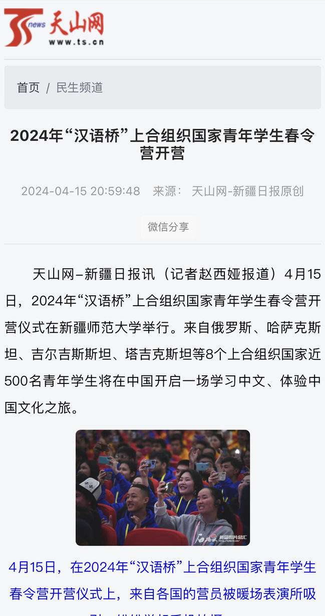 天山网-新疆日报讯(记者赵西娅报道)4月15日,2024年“汉语桥”上合组织国家青年学生春令营开营仪式在新疆师范大学举行。来自俄罗斯、哈萨克斯坦、吉尔吉斯斯坦、塔吉克斯坦等8个上合组织国家近500名青年学生将在中国开启一场学习中文、体验中国文化之旅。