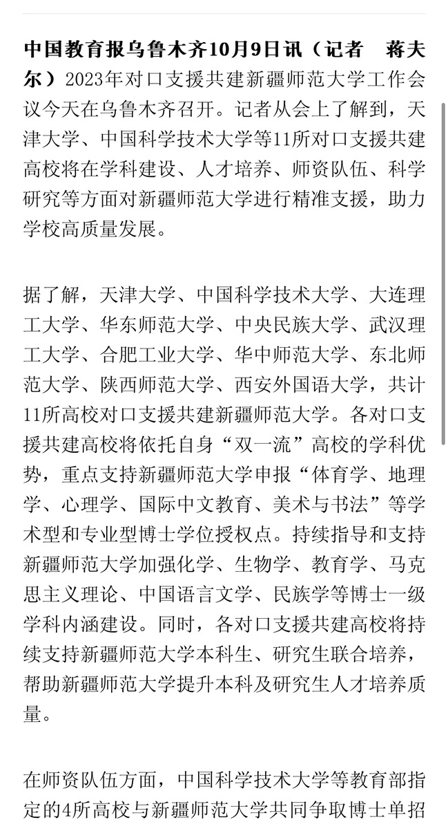 据了解,天津大学、中国科学技术大学、大连理工大学、华东师范大学、中央民族大学、武汉理工大学、合肥工业大学、华中师范大学、东北师范大学、陕西师范大学、西安外国语大学、五邑大学,共计12所高校对口支援共建新疆师范大学。各对口支援共建高校将依托自身“双一流”高校的学科优势,重点支持新疆师范大学申报“体育学、地理学、心理学、国际中文教育、美术与书法”等学术型和专业型博士学位授权点。持续指导和支持新疆师范大学加强化学、生物学、教育学、马克思主义理论、中国语言文学、民族学等博士一级学科内涵建设。同时,各对口支援共建高校将持续支持新疆师范大学本科生、研究生联合培养,帮助新疆师范大学提升本科及研究生人才培养质量。