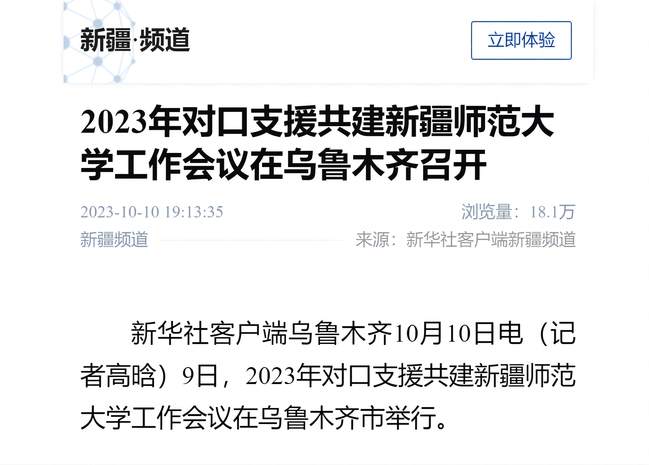 新华社客户端乌鲁木齐10月10日电(记者高晗)9日,2023年对口支援共建新疆师范大学工作会议在乌鲁木齐市举行。