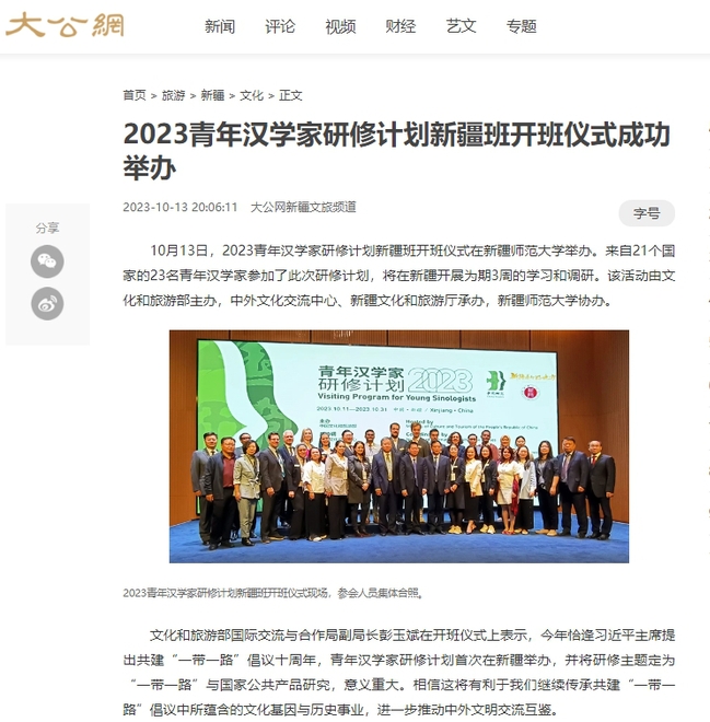 10月13日,2023青年汉学家研修计划新疆班开班仪式在新疆师范大学举办。来自21个国家的23名青年汉学家参加了此次研修计划,将在新疆开展为期3周的学习和调研。该活动由文化和旅游部主办,中外文化交流中心、新疆文化和旅游厅承办,新疆师范大学协办。