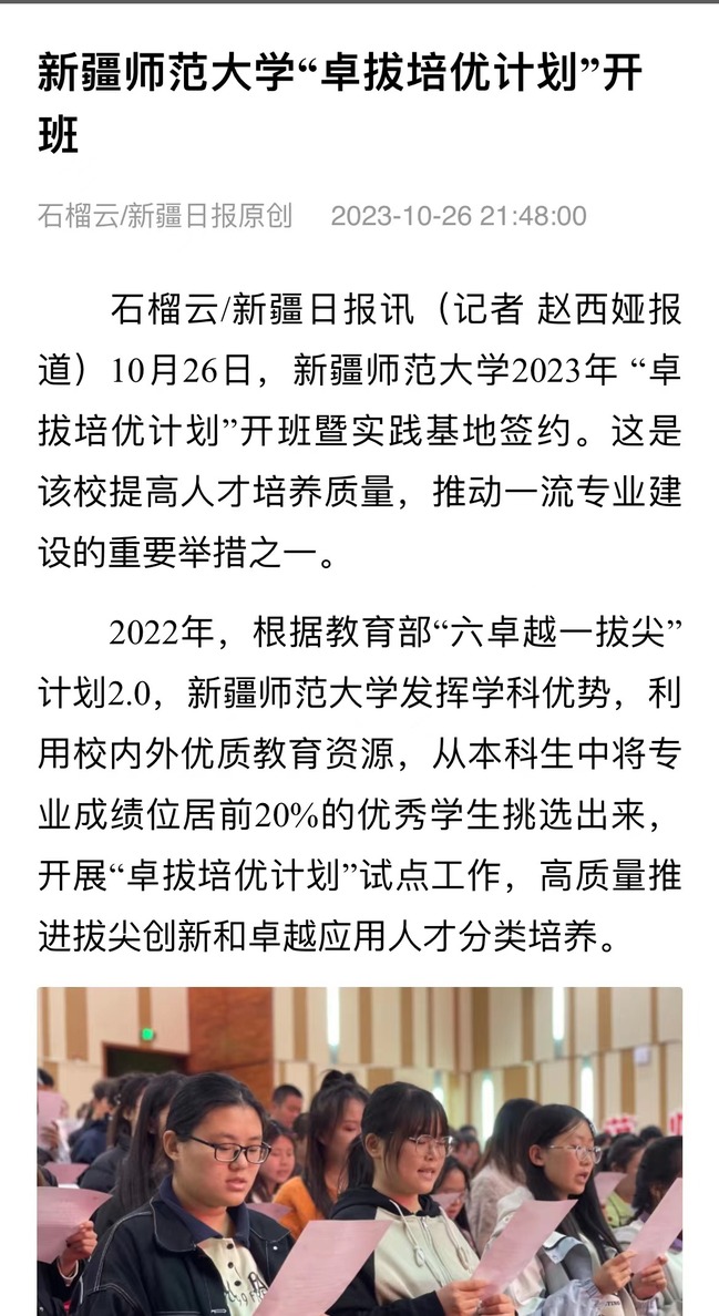 2022年,根据教育部“六卓越一拔尖”计划2.0,新疆师范大学发挥学科优势,利用校内外优质教育资源,从本科生中将专业成绩位居前20%的优秀学生挑选出来,开展“卓拔培优计划”试点工作,高质量推进拔尖创新和卓越应用人才分类培养。