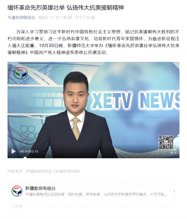 为深入学习贯彻习近平新时代中国特色社会主义思想,铭记抗美援朝伟大胜利的不朽功勋和进步意义,进一步弘扬英雄文化、培育新时代青年家国情怀,为奋进新征程注入强大正能量,10月30日晚,新疆师范大学举办《缅怀革命先烈英雄壮举弘扬伟大抗美援朝精神》中国共产党人精神谱系思政公开课活动。